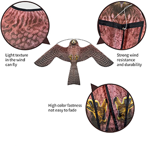 | N’occupe pas de place, l’opération est simple | Vivant: Les paillettes en mouvement effraient les oiseaux et la conception d’apparence bionique est plus vivante | Vent: Les cerfs-volants répulsifs contre les oiseaux conviennent aux vents inférieurs au niveau 6 |