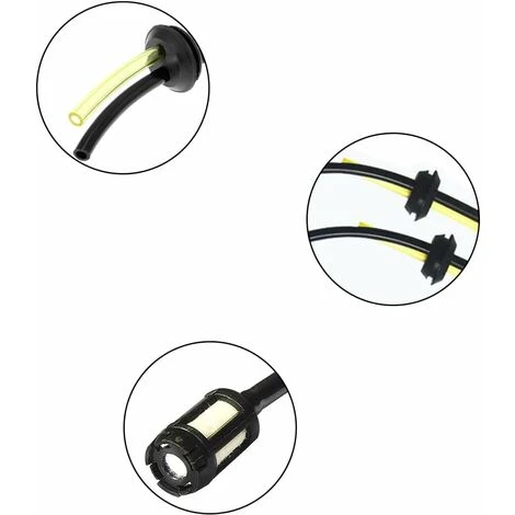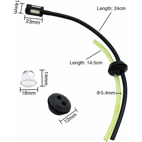 Diamètre du tuyau de carburant jaune et noir: environ 3 mm à l’intérieur – 5,5 mm à l’extérieur, adapté aux moteurs avec une ouverture de réservoir de carburant de 18 mm.