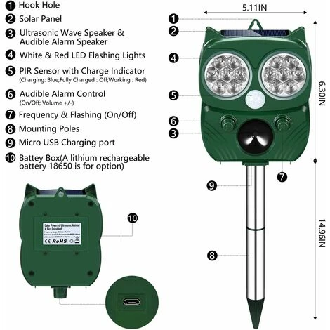 Chargement par Energie Solaire, USB ou Batterie – 1. Lorsque l’énergie solaire est suffisante, vous pouvez charger répulsif chat par le panneau solaire placé sur le dessus de l’appareil. 2. Équipé d’une interface USB et d’un câble de chargement USB, vous pouvez charger le répulsif chat via USB.